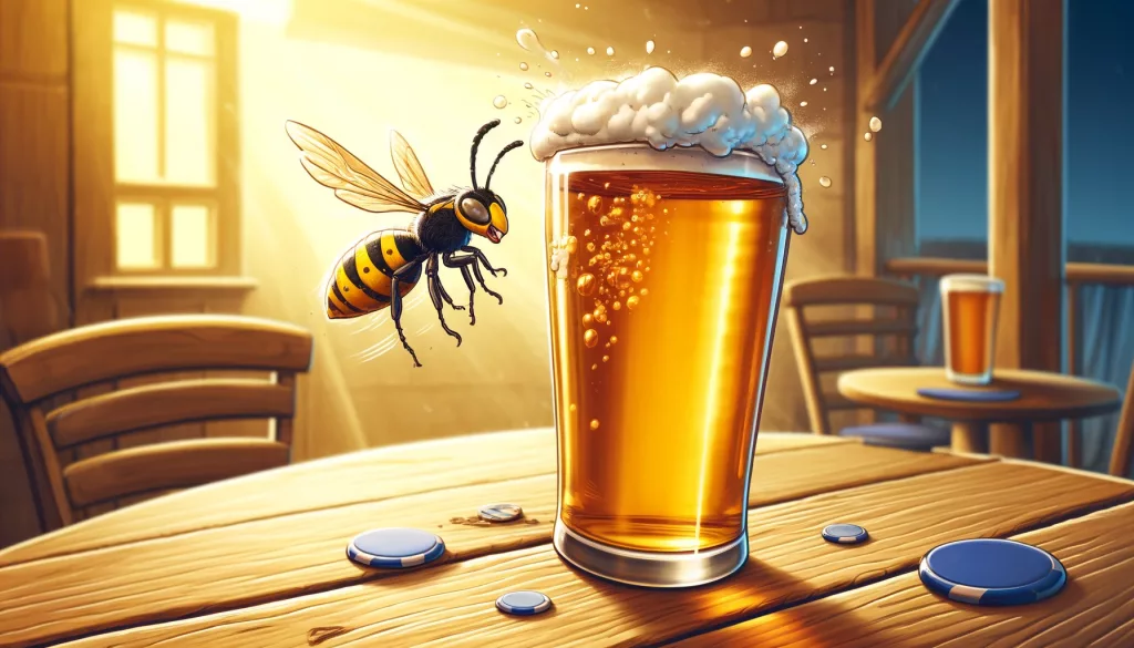 Lorsque l’été est bien installé et que je savoure ma bière en terrasse, une guêpe insistante décide de me rendre visite. Après plusieurs tentatives de la chasser, elle finit par tomber dans ma pinte. Alors que je la regarde se débattre dans le liquide, je me demande : Dans cette scène d’été où l’insecte est pris au piège, est-il possible que cette guêpe se retrouve dans un état d’ivresse inattendu ?