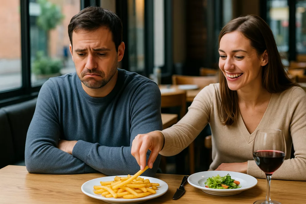 L’homme explique que le scénario est toujours identique. Lorsqu’ils passent commande au restaurant, sa compagne affirme ne pas vouloir de frites. Pourtant, dès que son assiette arrive, elle commence à piocher dedans, d’abord discrètement, puis de plus en plus ouvertement. Selon lui, la scène se répète à chaque sortie, créant une frustration durable mais difficile à prendre au sérieux tant la situation paraît anodine.