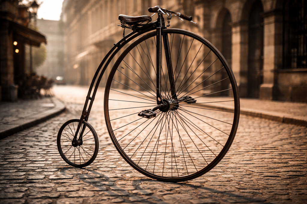 Le « grand bi », né peu après, représente une tentative audacieuse d’accroître la vitesse. Avec sa roue avant gigantesque et sa roue arrière minuscule, il impressionne par sa hauteur. Cependant, son instabilité le rend dangereux, et les accidents ne tardent pas à effrayer les cyclistes de l’époque.