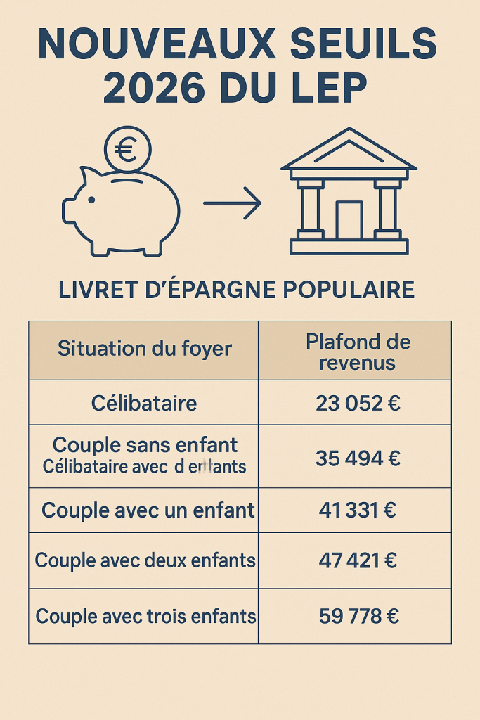 Mais voilà : Pour l’année 2026, les seuils de revenus pouvant donner droit au LEP sont désormais revalorisés. Pour un célibataire, le nouveau plafond est fixé à 23 052 €. Pour un couple sans enfant ou un célibataire avec deux enfants, le plafond grimpe à 35 494 €. Pour un couple avec un enfant, la limite s’établit à 41 331 €, et à 47 421 € pour un couple avec deux enfants. Un couple avec trois enfants ne doit pas dépasser 59 778 €.