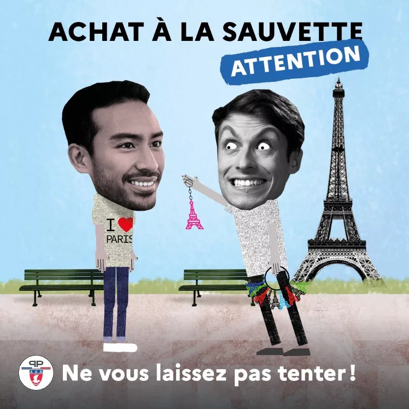 « N’achetez aucun objet à des vendeurs à la sauvette ! Vous alimentez des réseaux clandestins et illégaux. Préférez les revendeurs autorisés pour des souvenirs sûrs et de qualité. Ne vous laissez pas tenter ! »